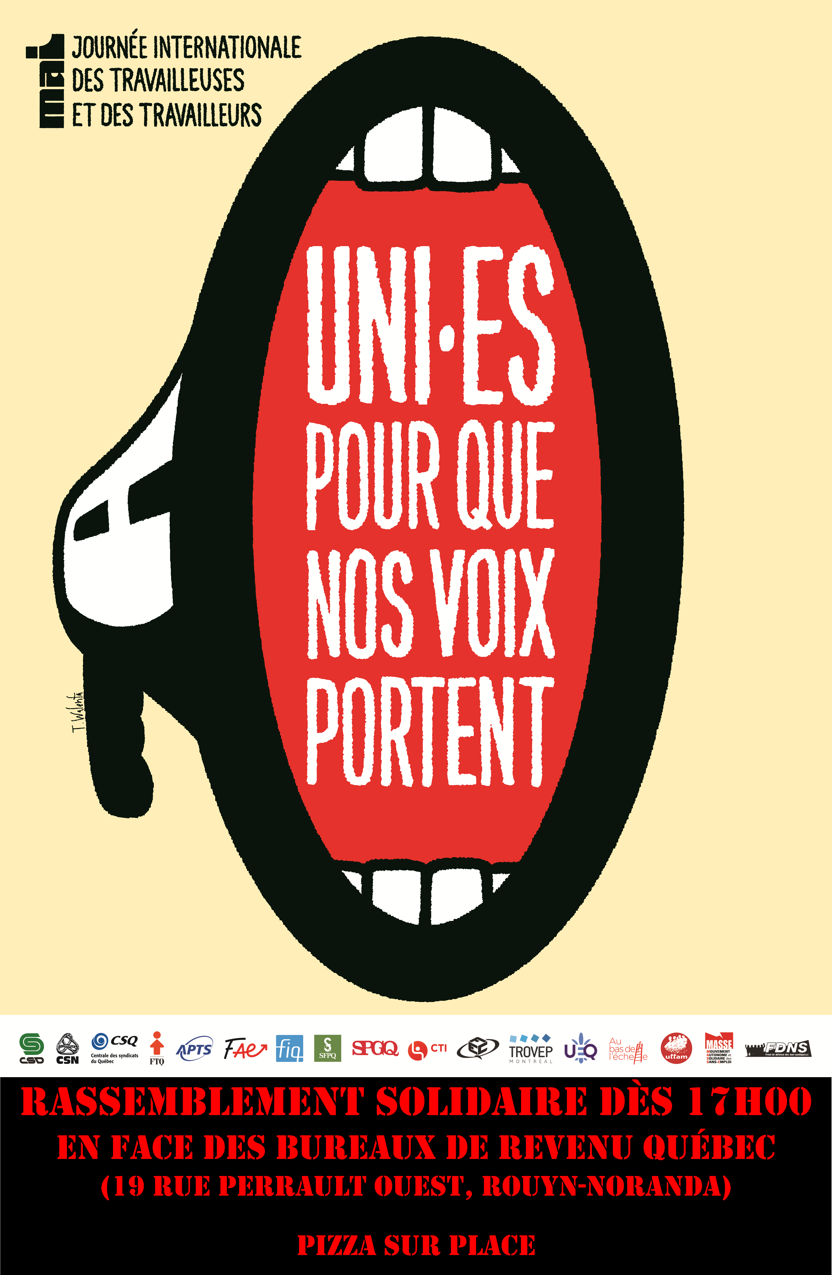 Action politique organisée conjointement par les syndicats et les organismes communautaires du territoire. De la pizza sera offerte sur place.